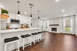 Dining and living areas continue the custom feel with added wall-to-wall cabinetry, butcher block counters, recessed lighting, and a redesigned fireplace with stone surround and custom mantle.